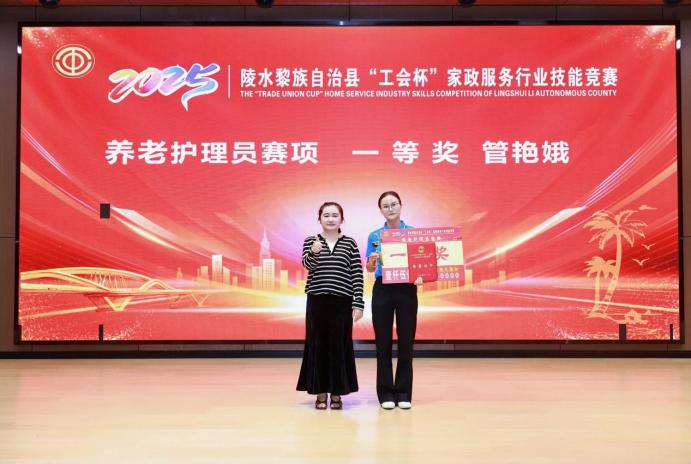 2025年11月25日至26日,海南陵水黎族自治县“工会杯”家政服务行业技能竞赛在陵水县职工活动中心一楼多媒体会议室举办。大赛汇聚来自全县各机构的60名养老护理员参赛。经过激烈角逐,我院2022级养老服务管理本科专业管艳娥同学凭借扎实的专业知识、精湛的养老实践技能和出色的应变能力,斩获大赛“养老护理员赛项”一等奖。